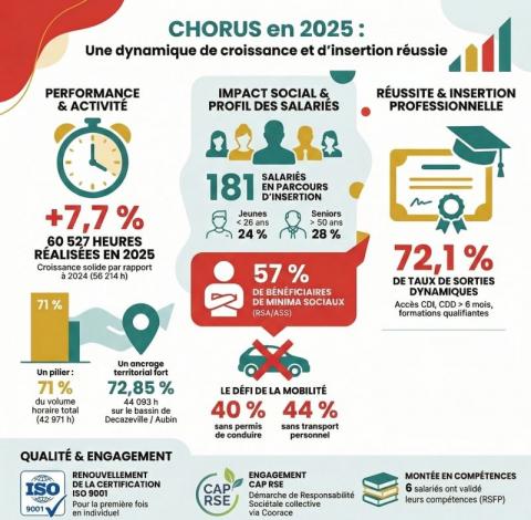 L’activité est en forte progression en 2025 pour Chorus, avec plus de 60 000 heures réalisées, soit une hausse de 7,7 % par rapport à 2024. Cette dynamique s’accompagne d’un ancrage territorial historique, puisque plus de 72 % de l’activité reste concentrée sur le bassin de Decazeville et d’Aubin. Le secteur non marchand demeure également un pilier important de l’association, représentant près de 71 % des missions de Chorus.